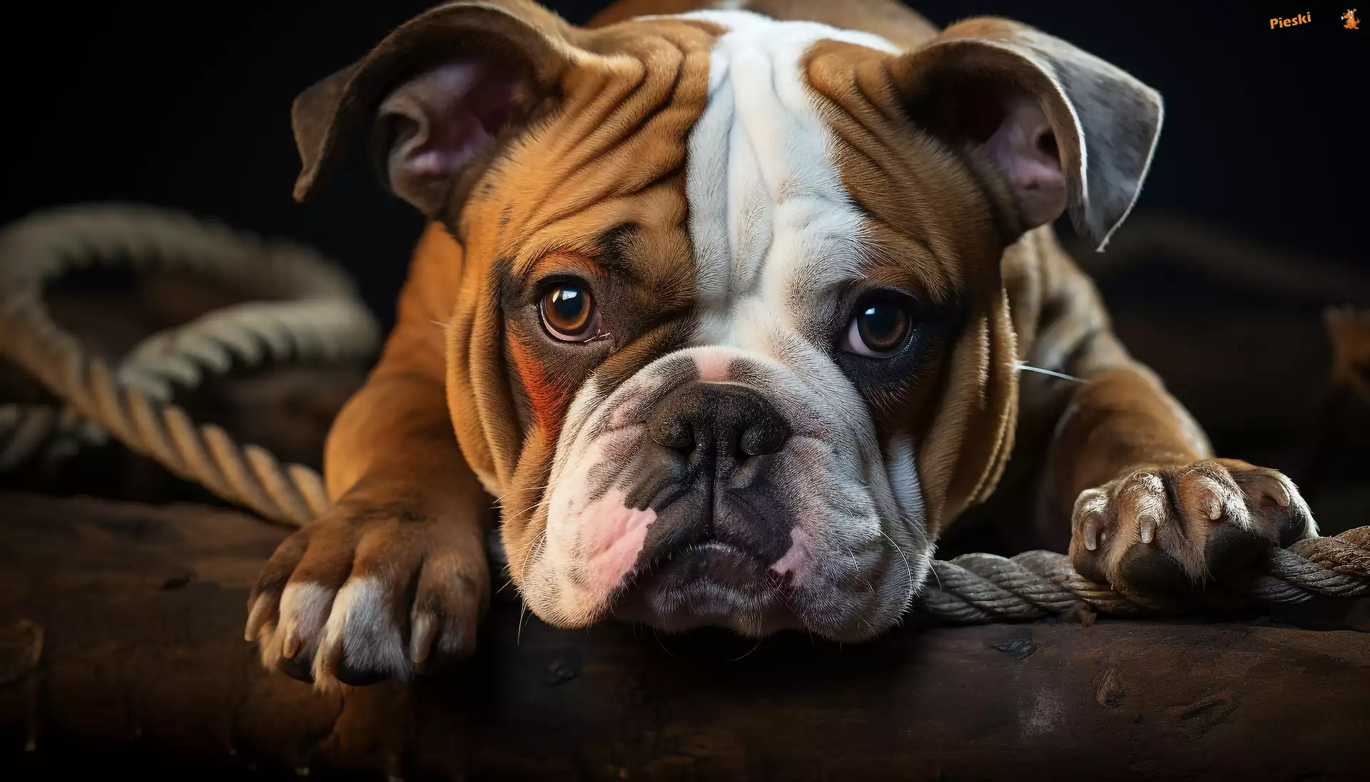 Drewno, Szczeniak, Buldog angielski, Pies, Lina, Spojrzenie, Pieski