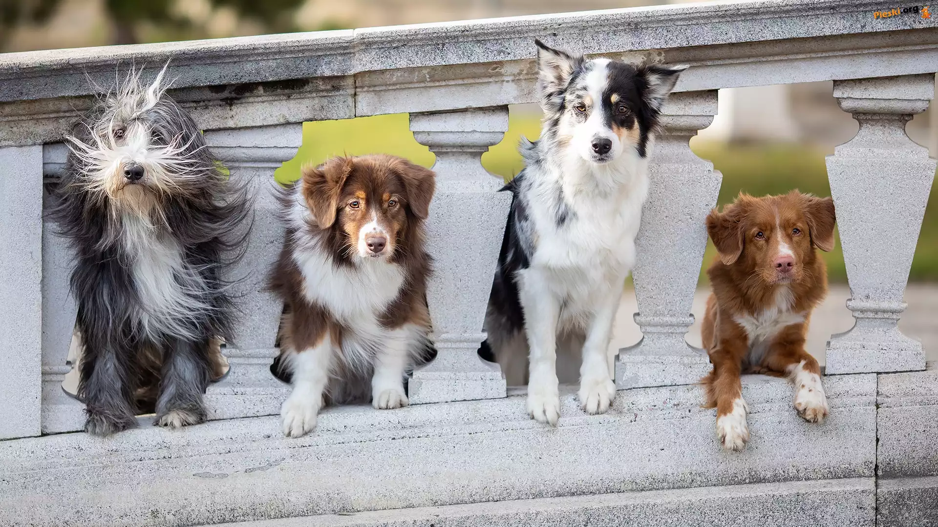 Border collie, Cztery, Retriever z Nowej Szkocji, Kamienna, Owczarek staroangielski Bobtail, Psy, Owczarek australijski, Balustrada |