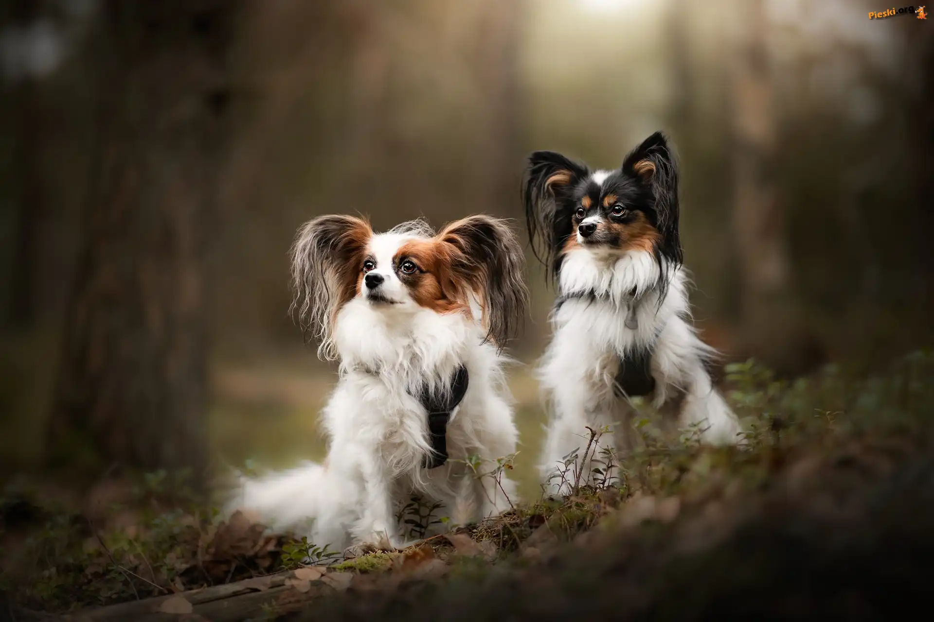 Dwa, Spaniele kontynentalne miniaturowe Papillon, Las, Psy, Drzewa