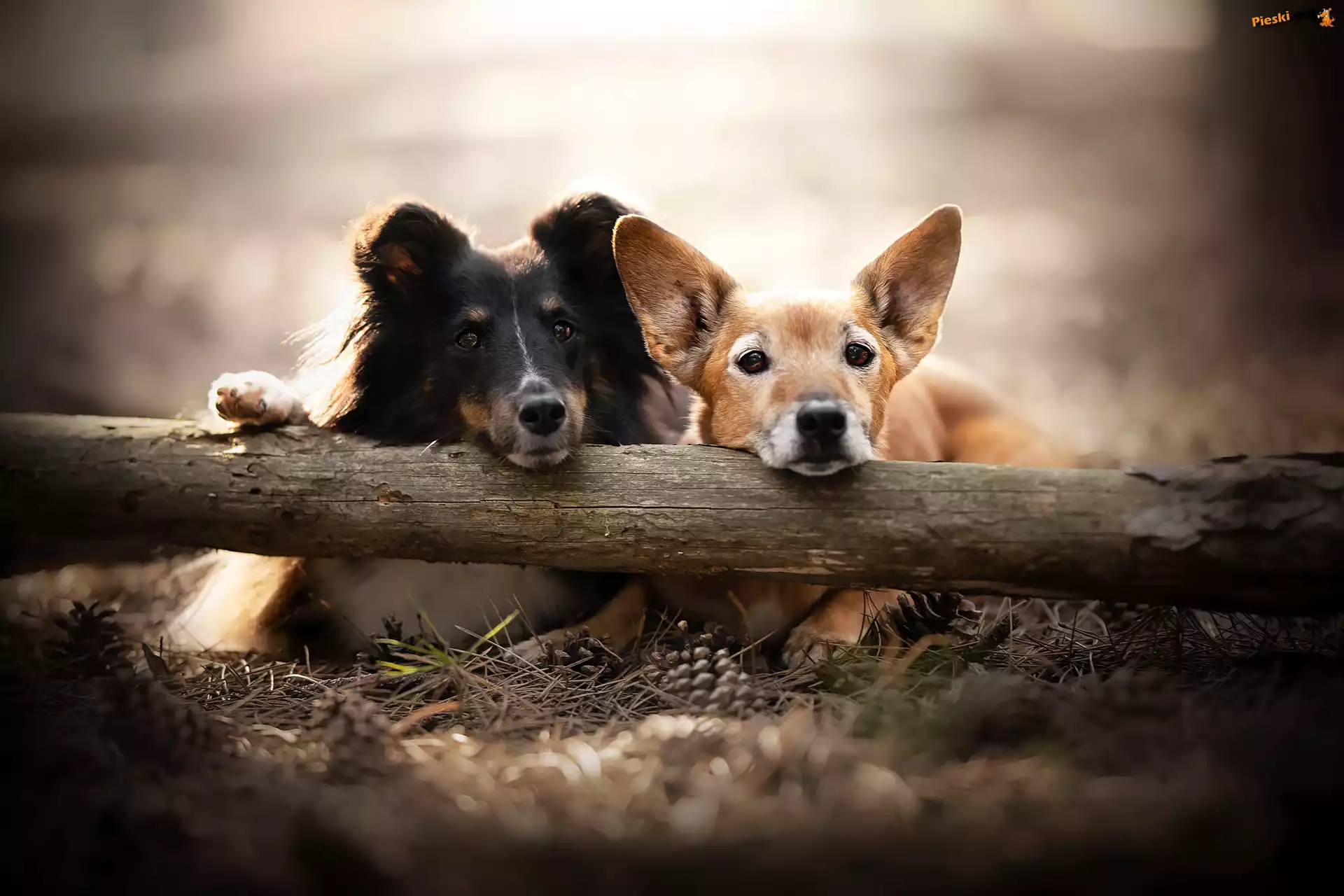 Kłoda, Dwa, Drzewa, Owczarek szetlandzki, Psy, Kundelek, Szyszki, Pieski