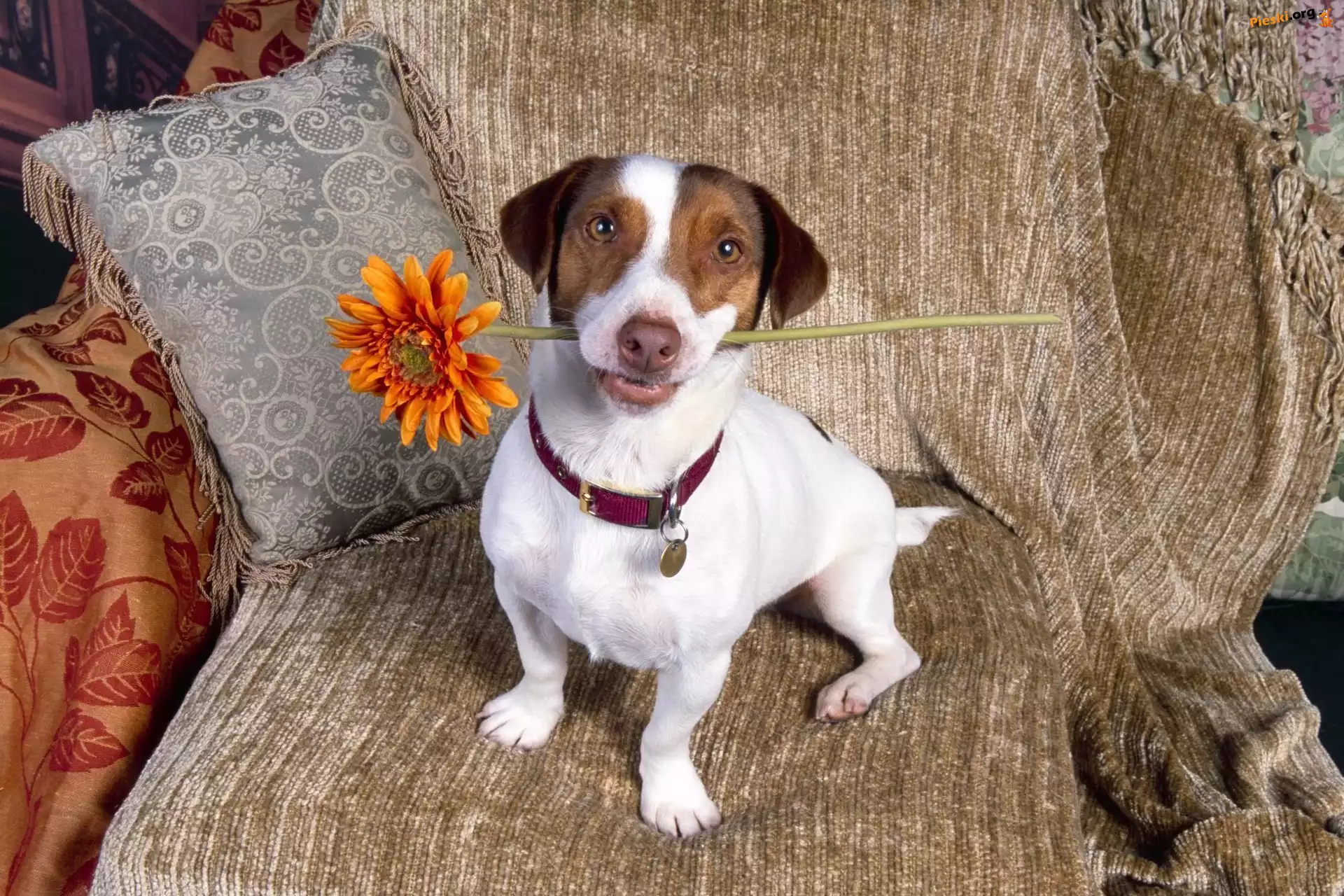 Fotel, Piesek, Kwiatek, Poduszka