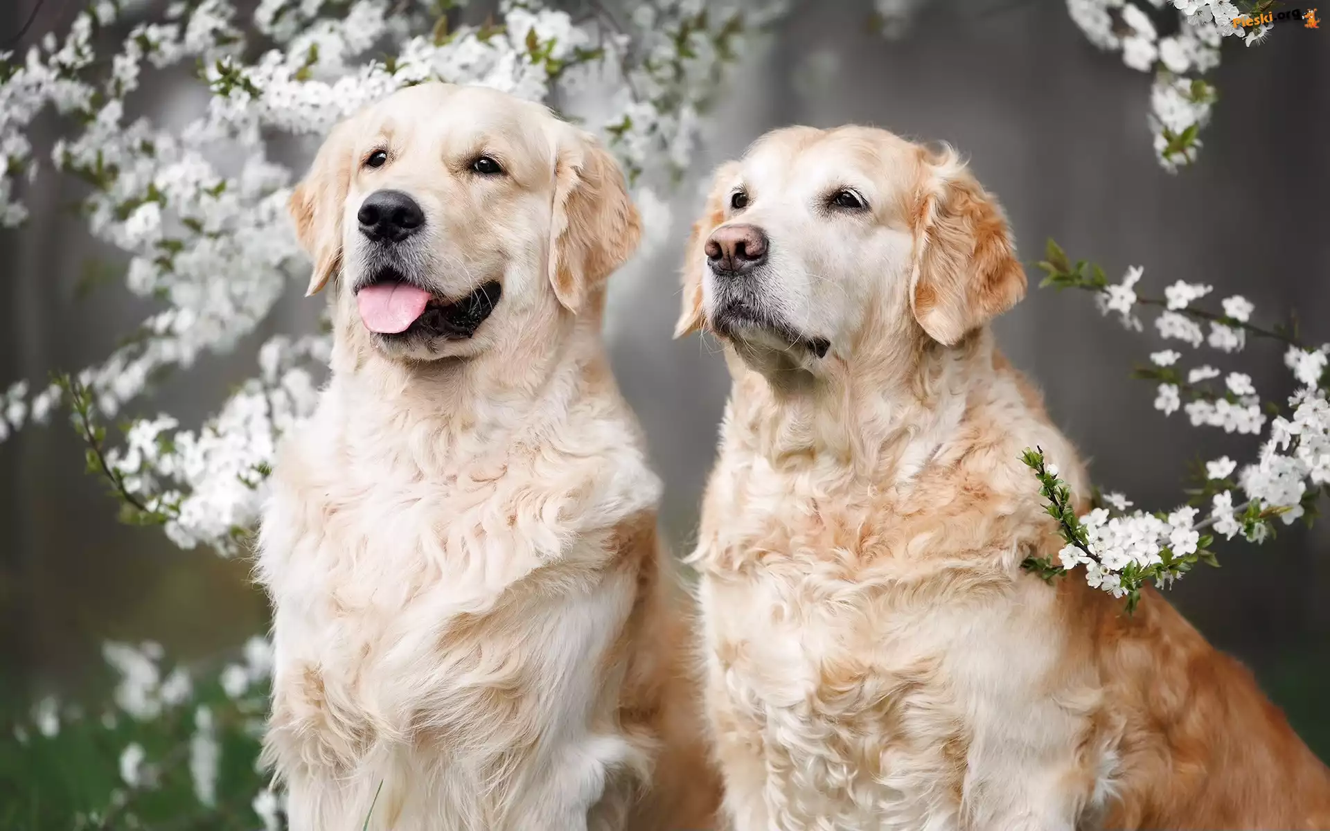 Dwa, Kwiaty, Psy, Gałązki, Golden retriever, Pieski