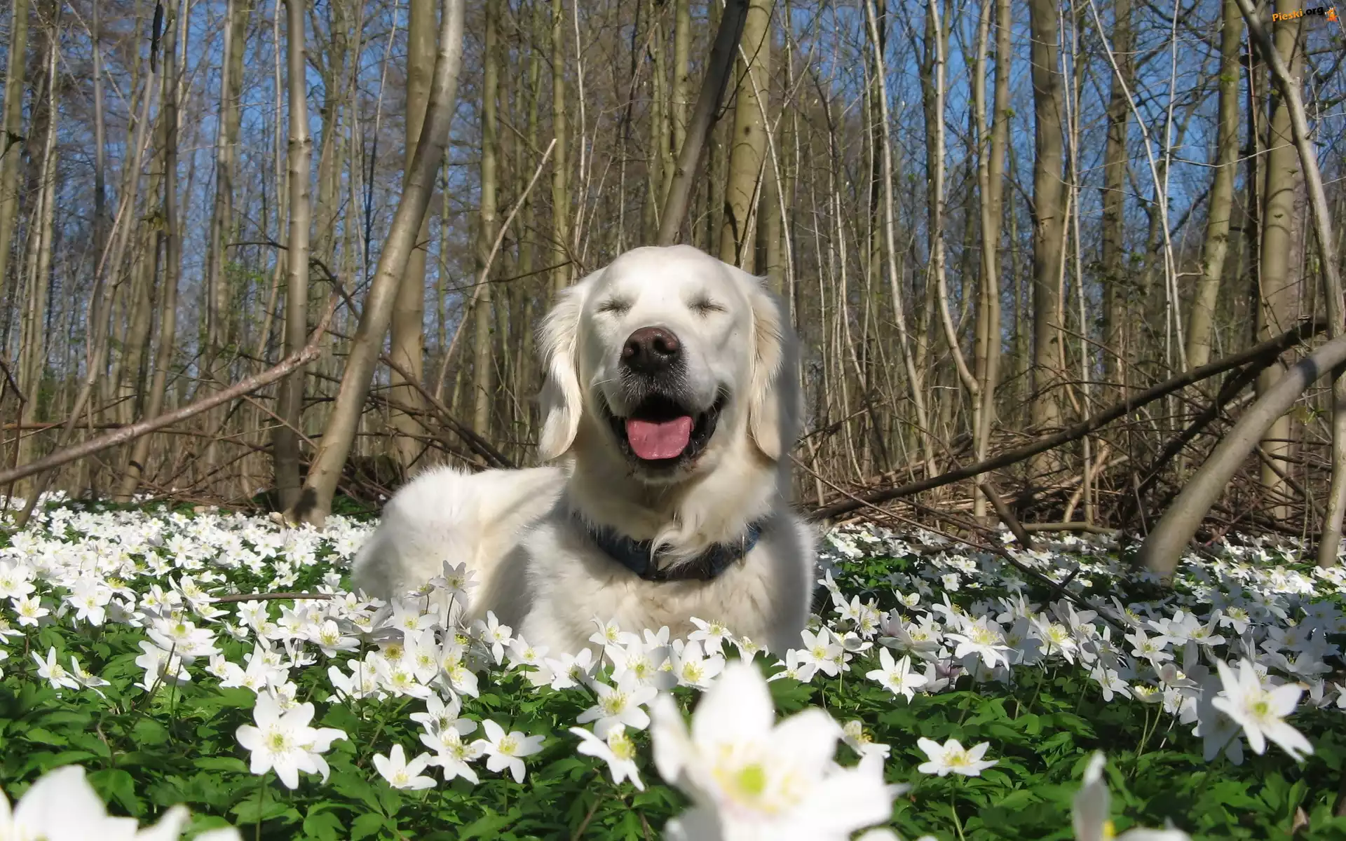 Golden Retriever, Kwiaty, Drzewa, Pieski