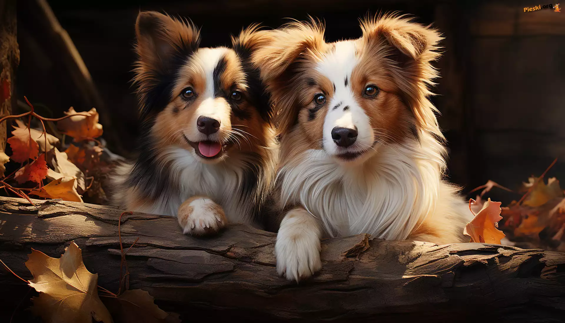 Grafika, Psy, Kłoda, Jesień, Dwa, Drzewo, Liście, Pieski