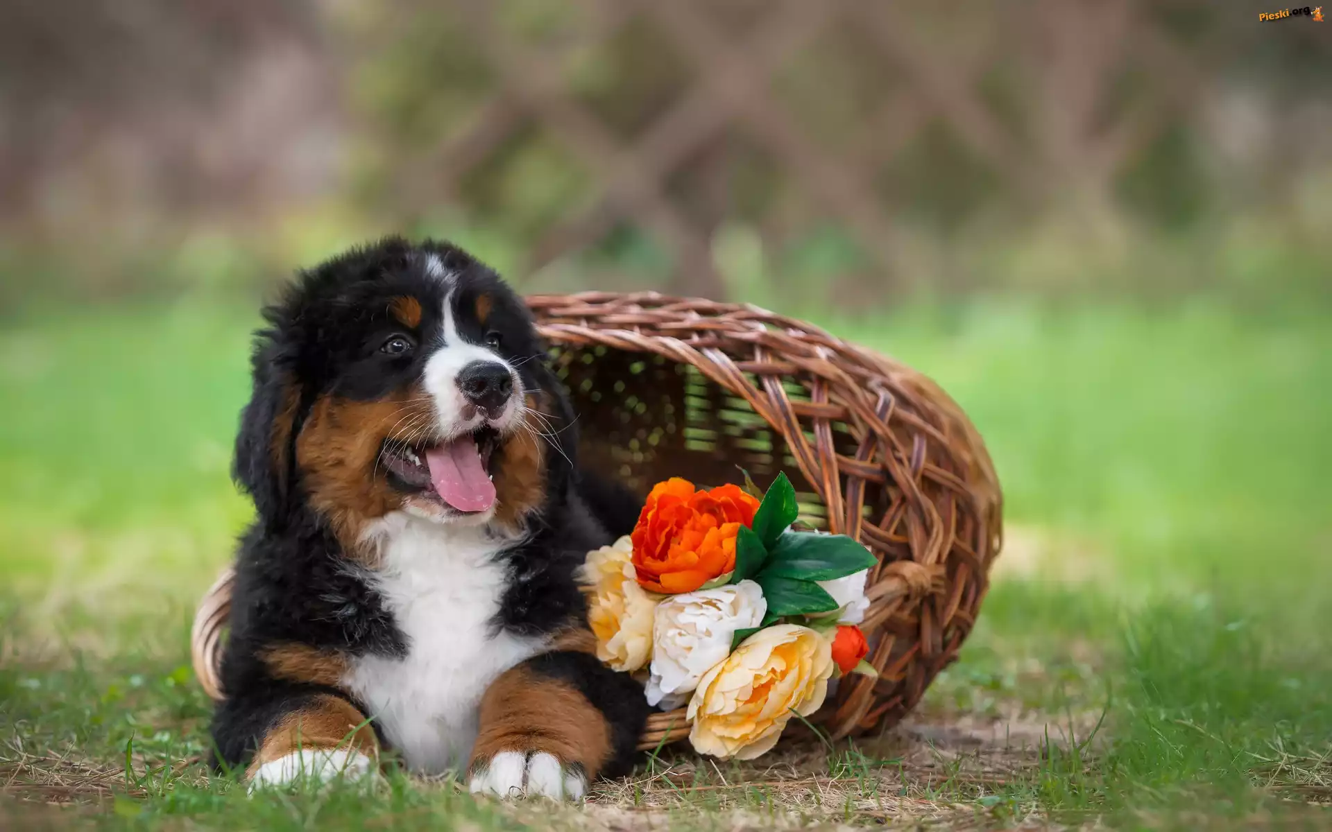 Koszyk, Berneński pies pasterski, Szczeniak, Kwiaty, Pieski