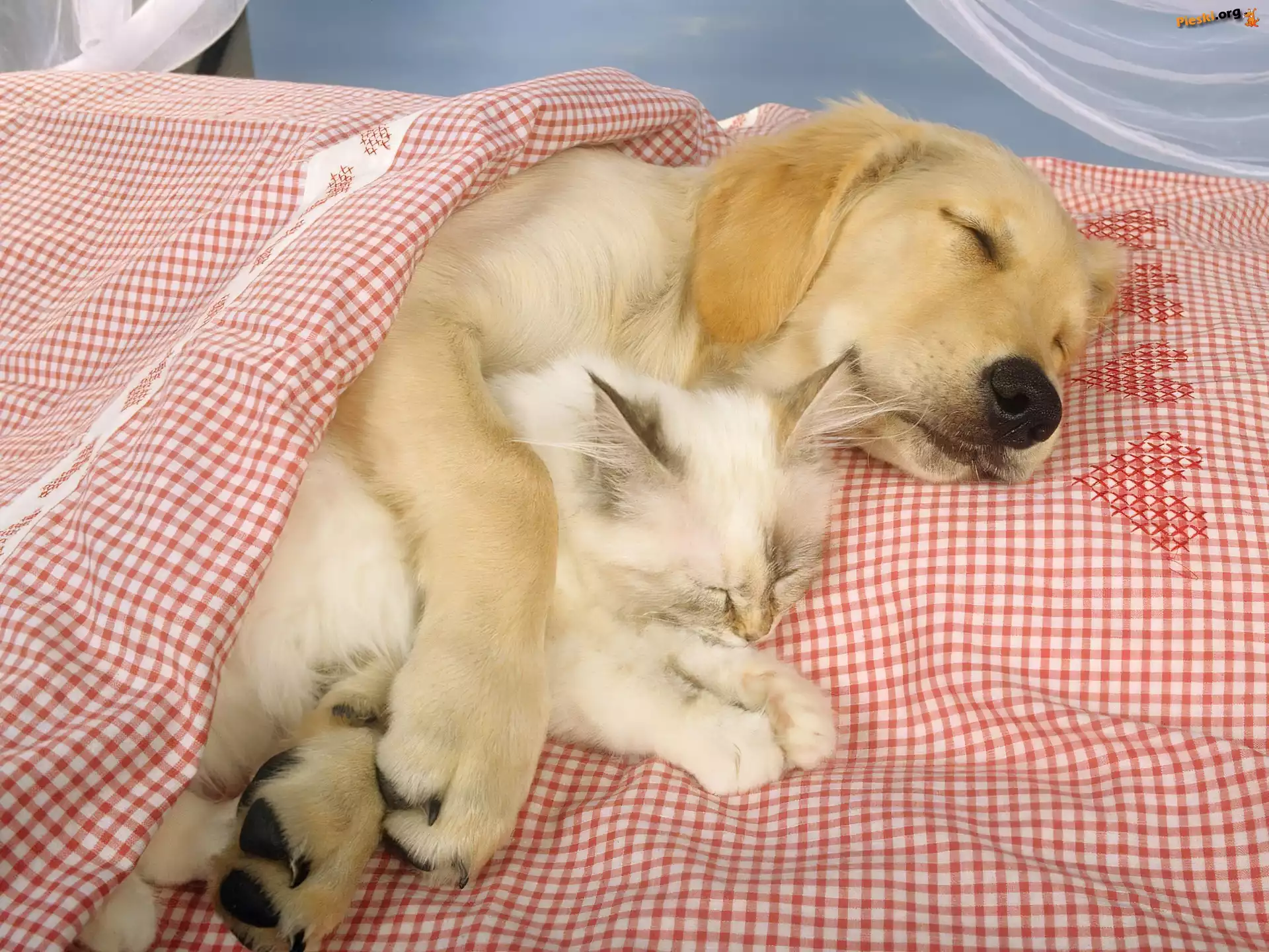 Kot, Śpiący, Pies, Pościel, Pieski