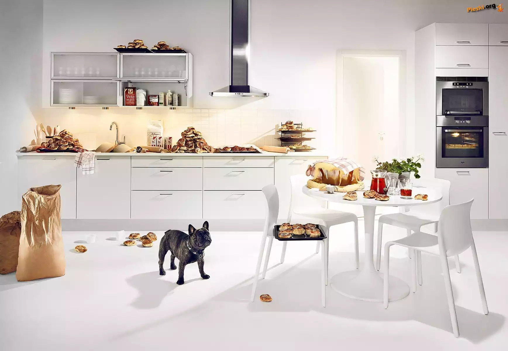 Kuchnia, Stół, Bułeczki, Pies, Słodkie, Krzesła
