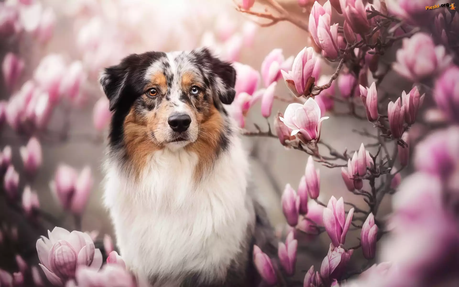 Magnolia, Kwiaty, Pies, Owczarek australijski, Pieski