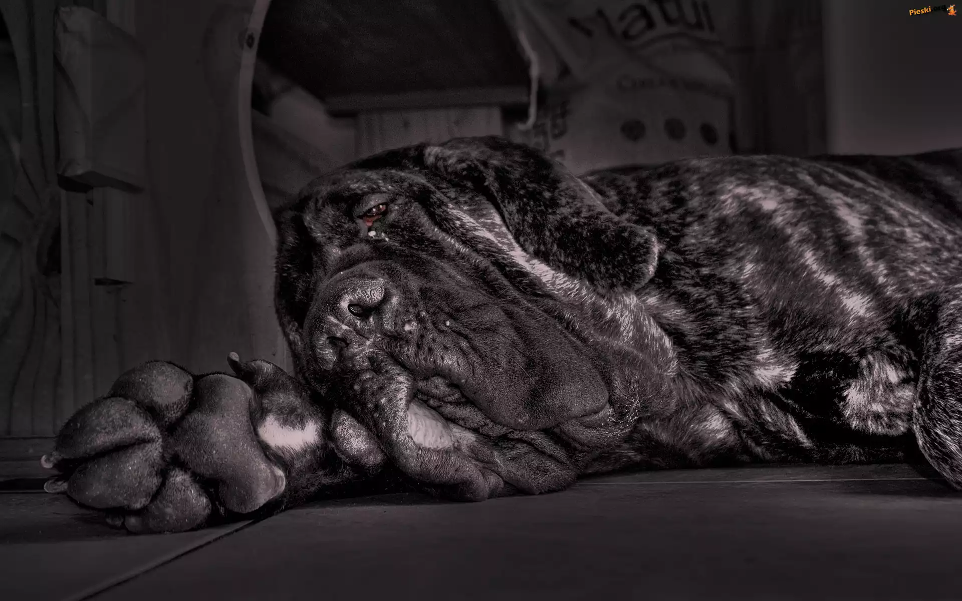 Pies, Mastif, Neapolitański Morda, Mastifa neapolitańskiego Mastif neapolitański, Pies, Szczeniak, Fotel Mastif, Odpoczynek Mastif neapolitański, szare, umaszczenie Mastif neapolitański, czerwona, obroża