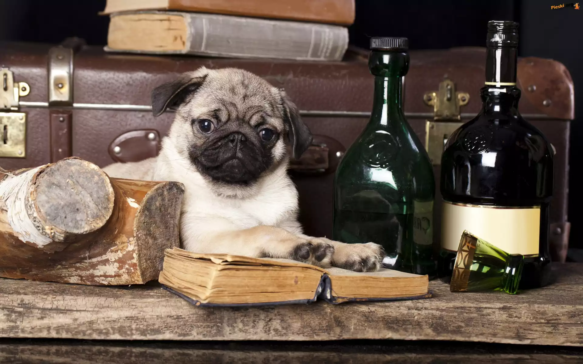 Mops, Pies, Szczeniak, Butelki, Pieski