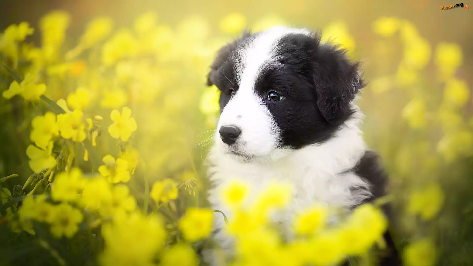 Żółte, Border collie, Szczeniak, Łąka, Kwiaty