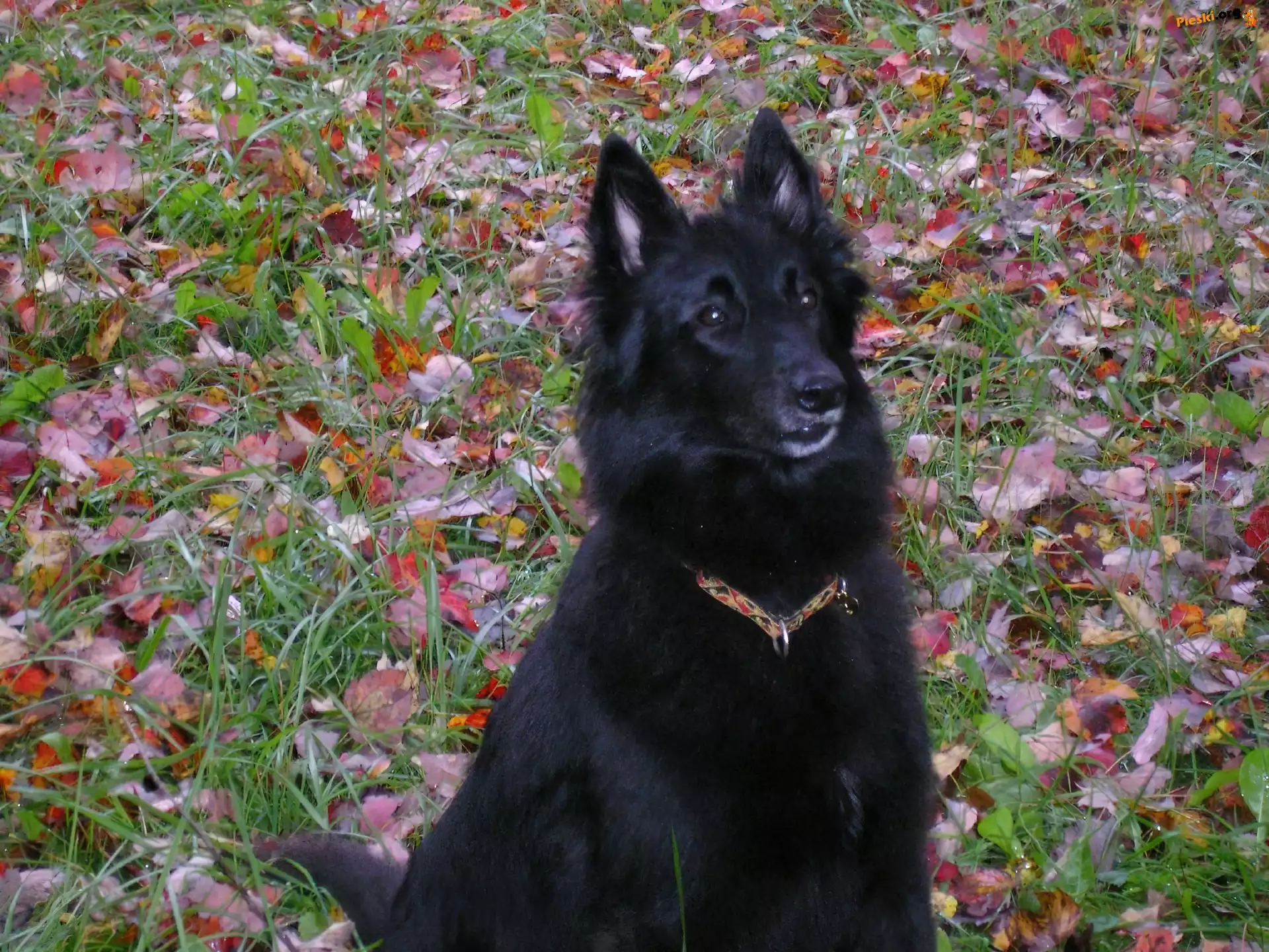Owczarek belgijski Groenendael, kolorowe, liście, Pieski