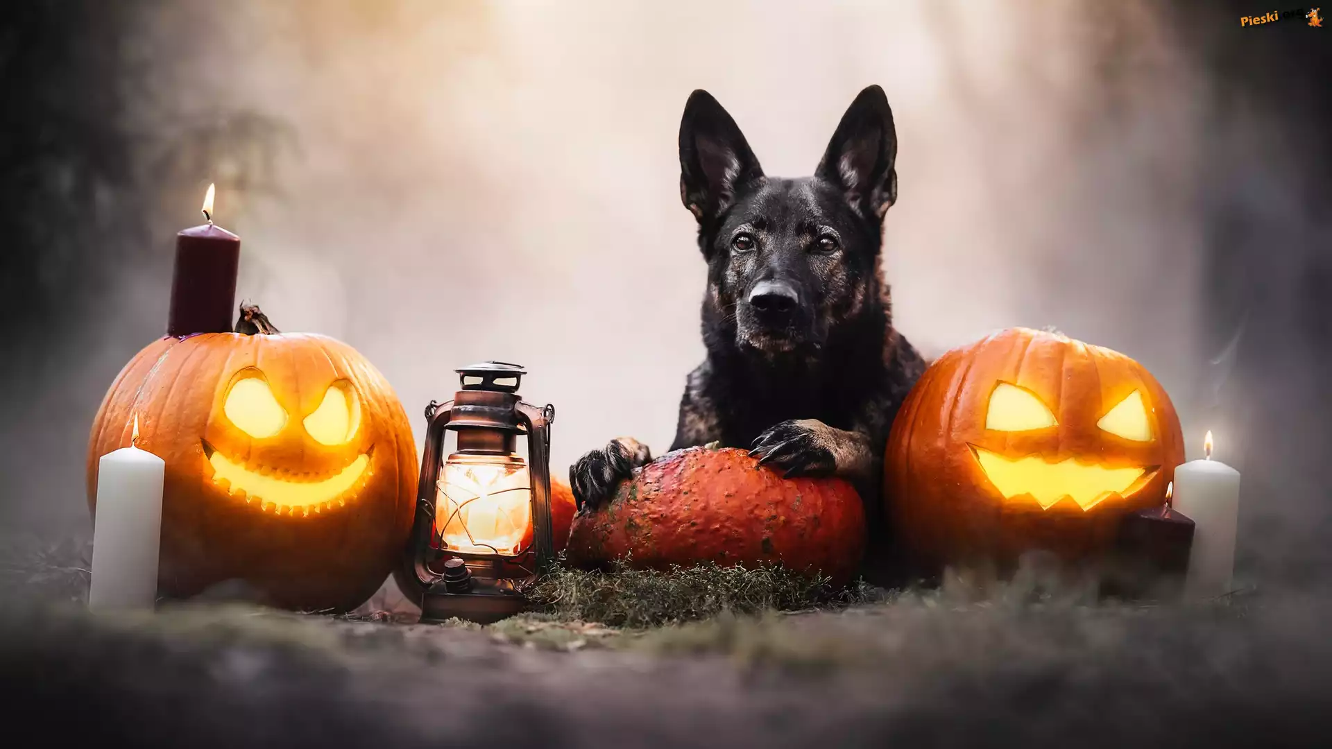 Halloween, Dynie, Latarnia, Pies, Dym, Świeca, Pieski
