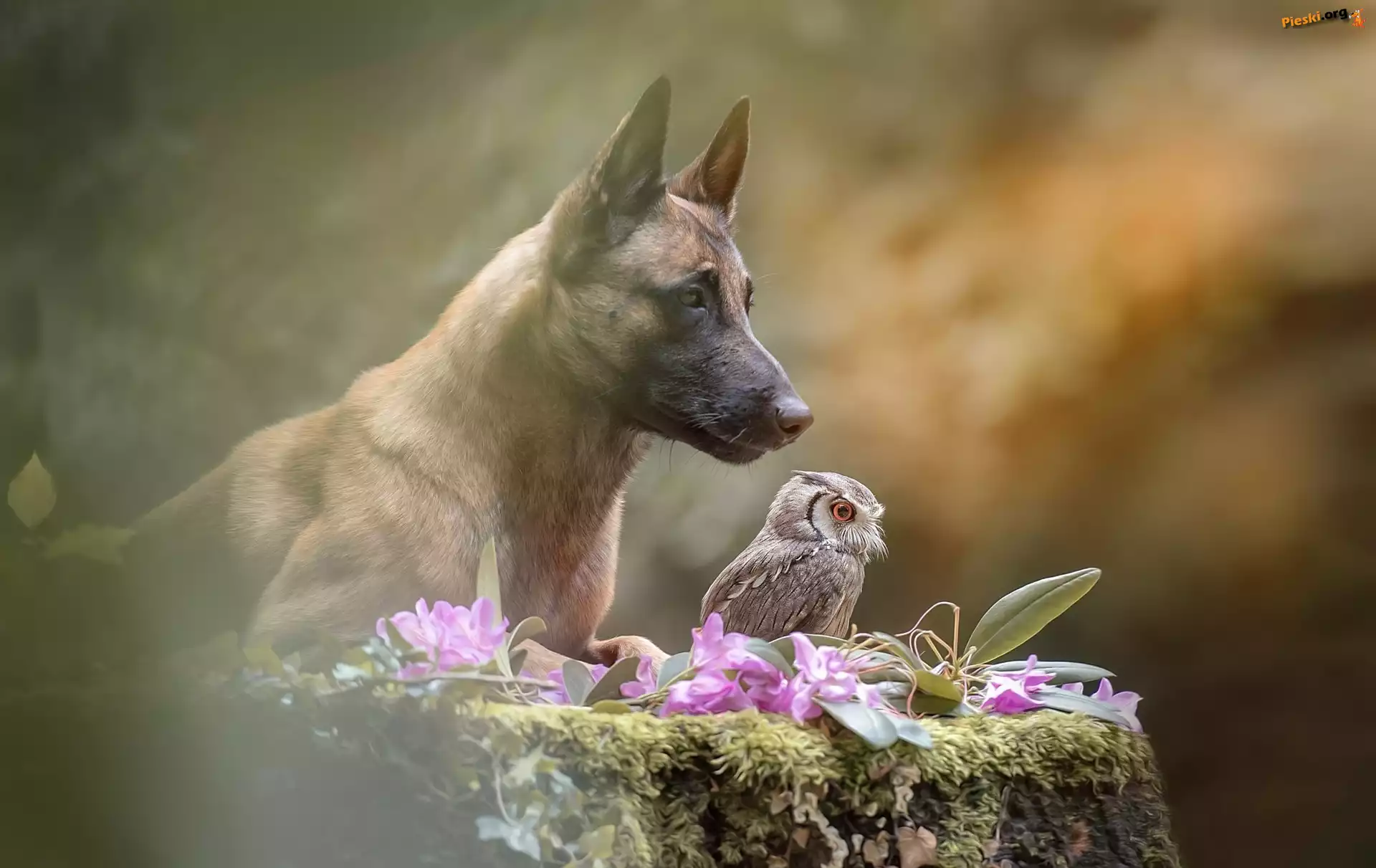Ptak, Syczek zwyczajny, Pies, Sowa, Owczarek belgijski Malinois Wrzosy, Pies, Rozmyte, Mordka, Owczarek belgijski malinois, Jęzor, Tło