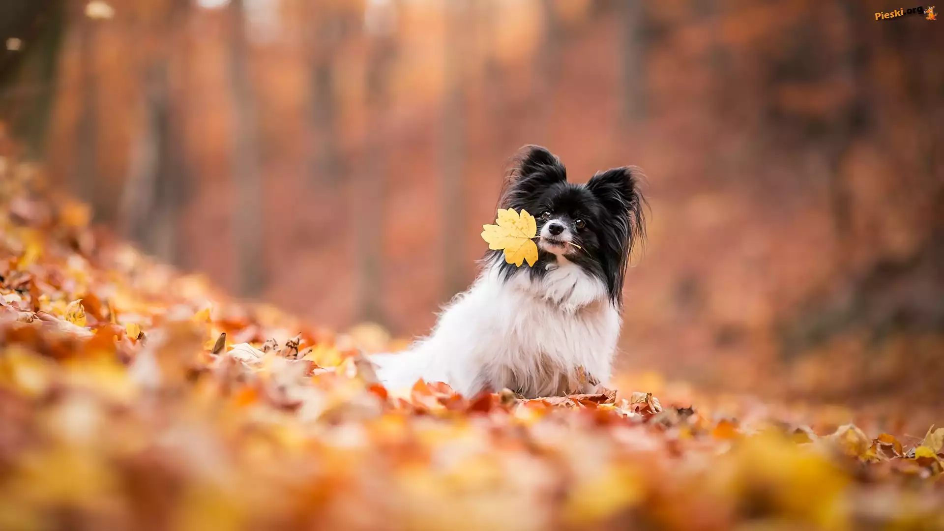Rozmyte, Spaniel kontynentalny miniaturowy Papillon, Pies, Liście, Tło, Pieski
