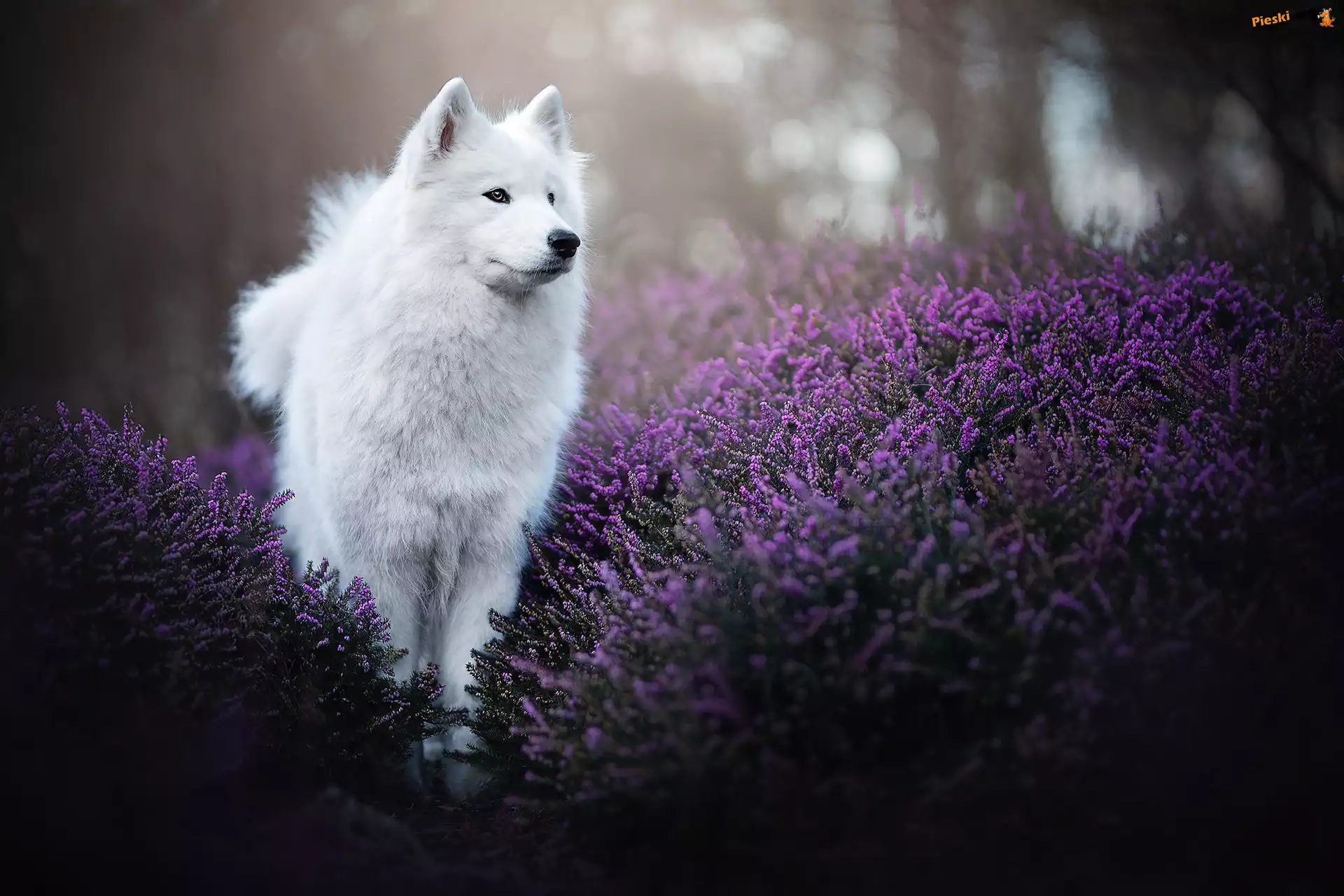 Szpic japoński, Biały, Pies, Wrzosy, Pieski