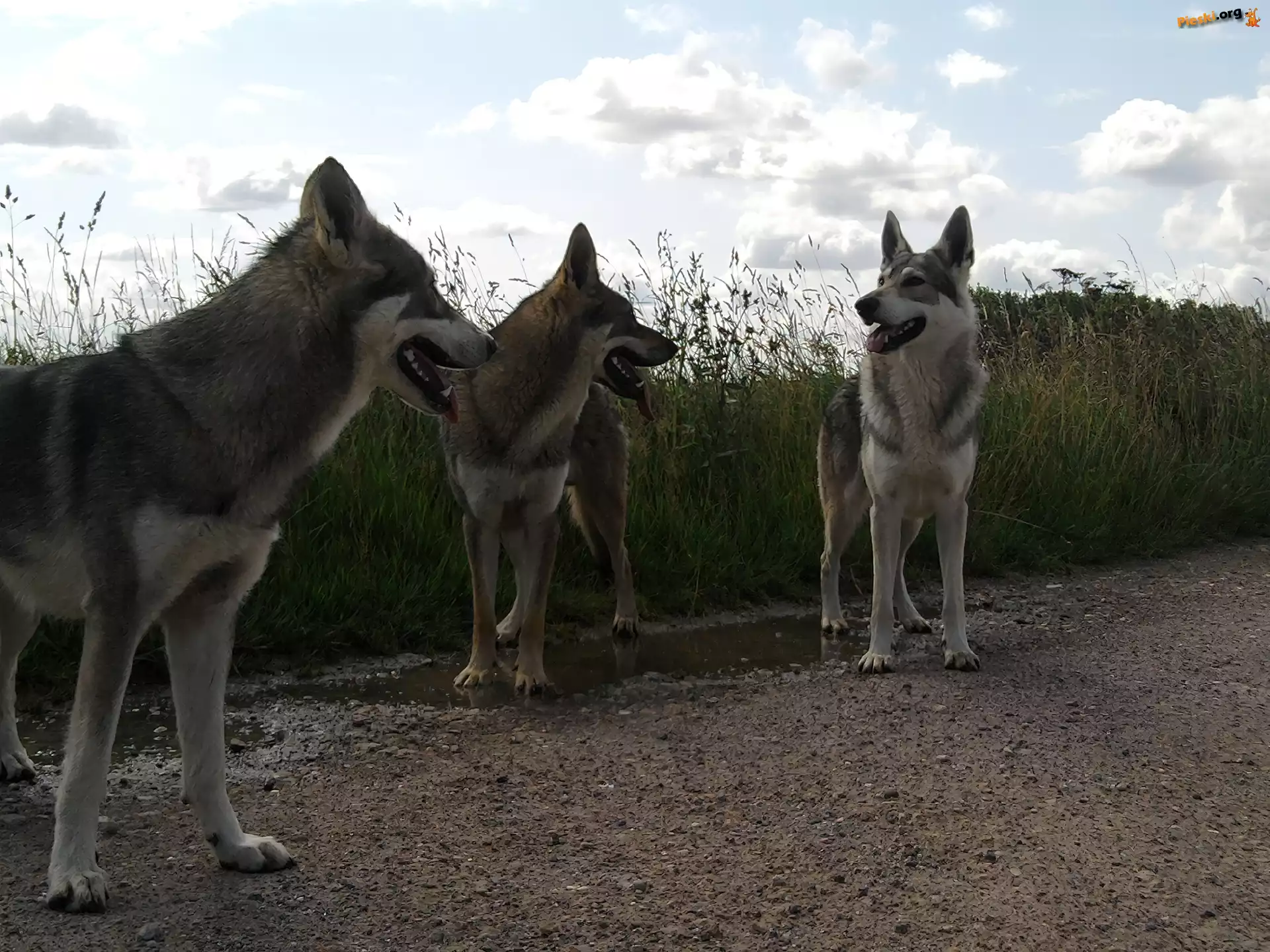 trzy, Saarlooswolfhond Saarlooswolfhond, śnieg, krzaki Saarlooswolfhond, uszy, postawione Saarlooswolfhond, woda