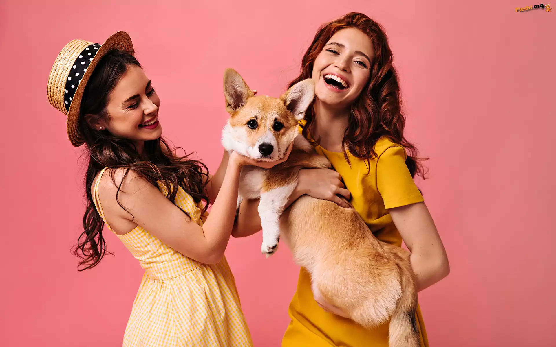 Welsh corgi pembroke, Młode, Kobiety, Pies, Dwie, Uśmiech, Kapelusz, Pieski