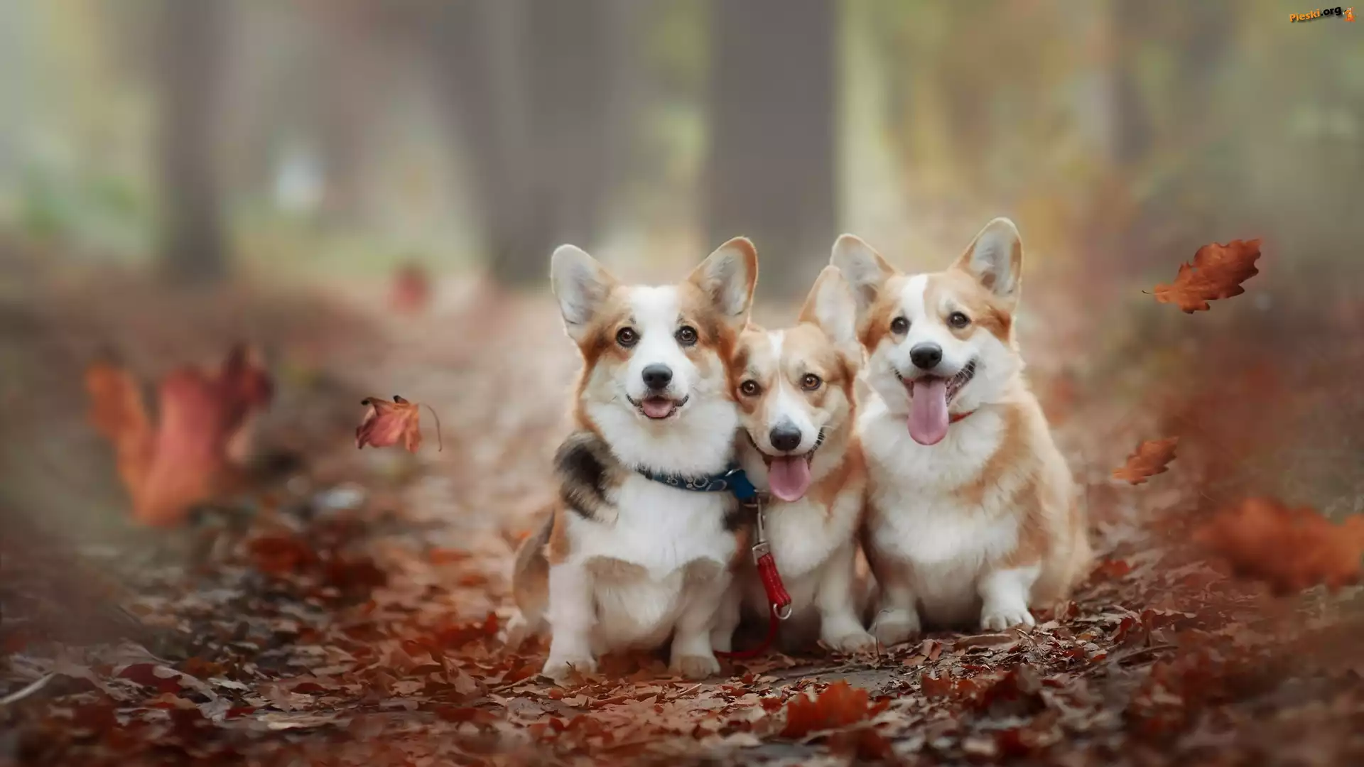 Welsh corgi pembroke, Trzy, Psy, Liście, Pieski