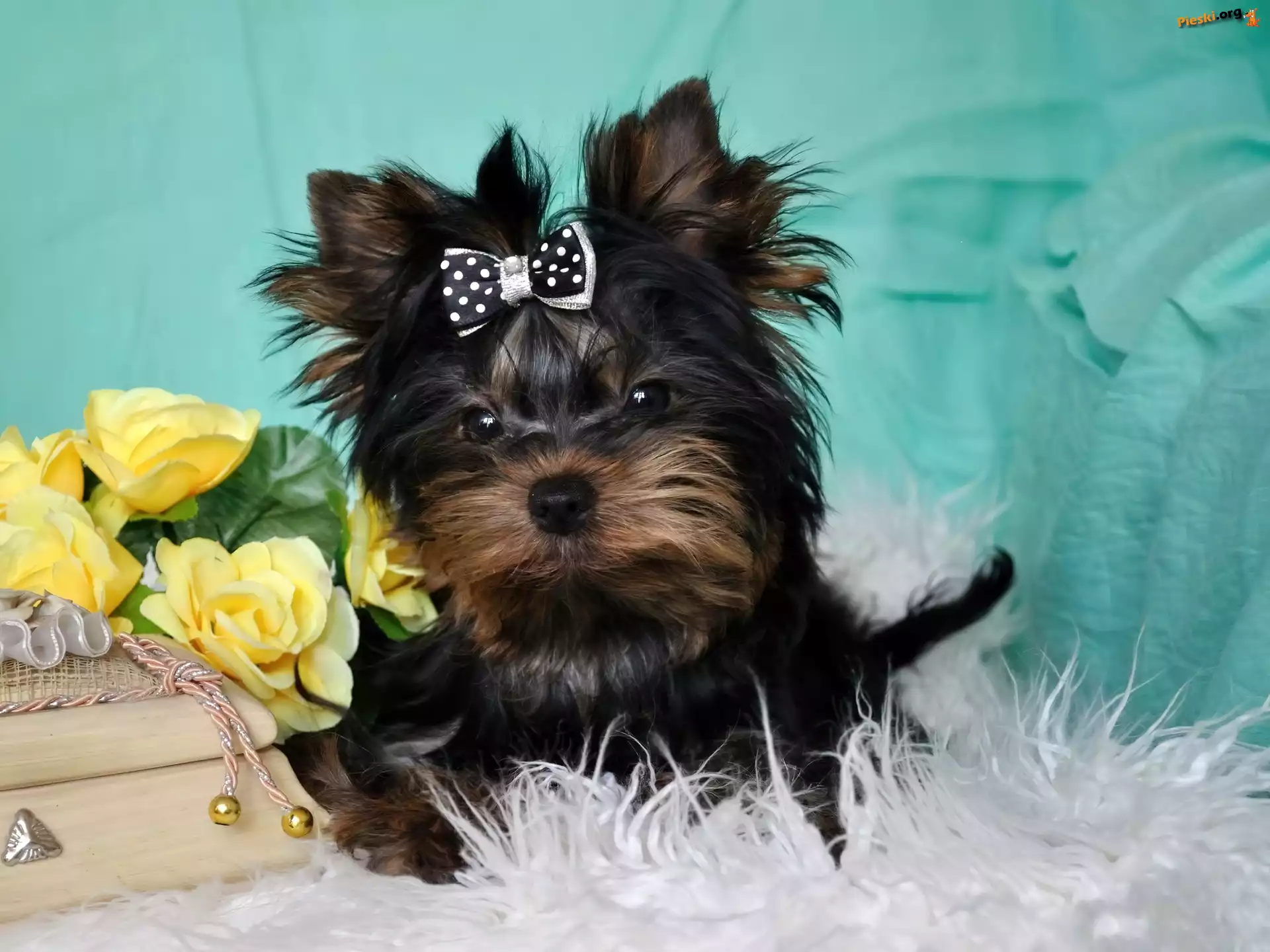 Dwa, Pieski, Yorkshire Terrier Kanapa, Yorki, Dwa Owczarek, York, Dwa, Niemiecki, Psy Pies, Yorkshire terrier, Kokardka Śmieszne, Pies, Ubranie, Trawa Siwy, Mały, York Mały, York, Maskotka Yorkshire terrier, Łąka, Koniczyna York, Futerko Mały, York Terier Smycz, Yorkshire Terrier, Piesek Dziecko, Pies, Posiłek Dwa, Szczeniaczki, Kufer