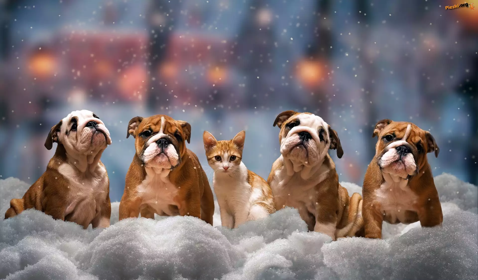 Cztery, Zima, Kot, Psy, Buldogi angielskie, Śnieg